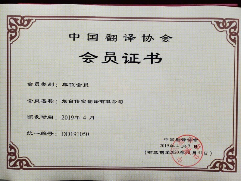 煙臺(tái)傳實(shí)翻譯有限公司正式成為中國(guó)翻譯協(xié)會(huì)會(huì)員